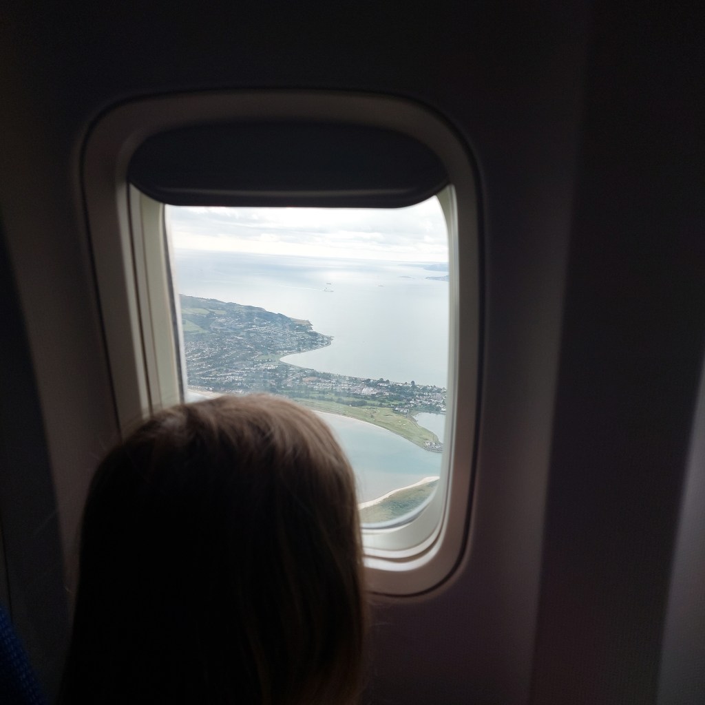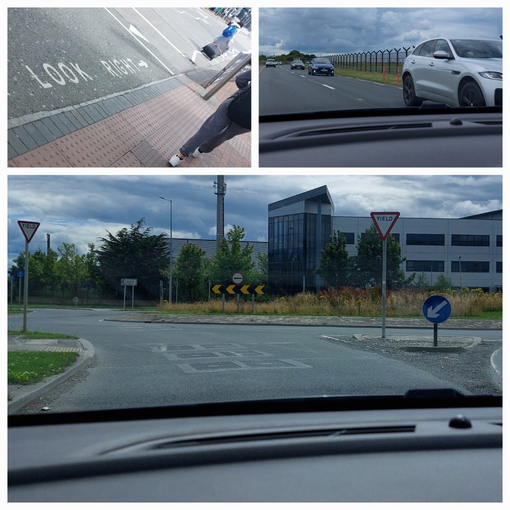 Der Flug verläuft ansonsten unkompliziert. Mein Gatte genießt einen Kaffee bei nun wieder normalisiertem Blutdruck, ich die Bullaugen-Optik aufs Meer, siehe oben. „Verlangsamung“ gibt es dann tatsächlich noch durch Verzögerungen beim Aussteigen aus dem Flugzeug am Ankunft-Flughafen Dublin. Abenteurer Frodo und ich schütteln beim Verlassen des Flugzeuges noch den Kopf, was die Leute so alles an persönlichen Dingen liegen lassen (Bücher, Kleidungsstücke, angefangene Getränke und Essen) bis uns in der Ankunfthalle eine freundliche Mitreisende unser Tablet in die Hand drückt. Wir hatten es auf dem Sitz liegengelassen. Auch am Gepäckband müssen wir noch lange warten. Den Kindern spürt man inzwischen die Erschöpfung an und sie werden unruhig und quengelig. Wir teilen uns auf: ich stärke mich mit den Kindern in einem Café (die Flugzeug- Sandwiches haben wir alle nicht herunterbekommen) und der tapfere Ritter Robert organisiert uns einen fahrbaren Untersatz. Dann beginnt das erste richtige Abenteuer: Linksfahren.