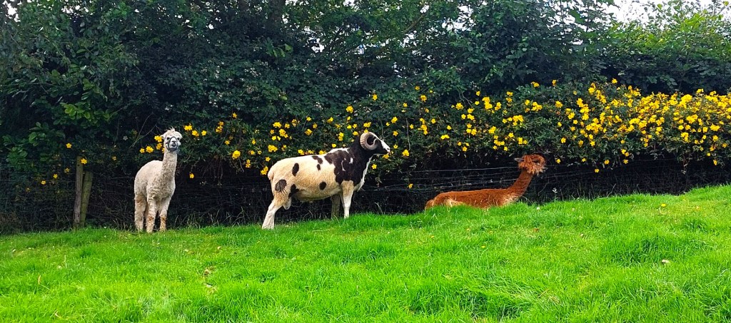 Bis auf ein paar Aufschreie meinerseits, wenn Ritter Robert das Auto etwas zu weit links am Straßenrand kommen lässt, kommen wir sicher am Hotel an. Die Kinder erfreuen sich an den Wiesen, die das Hotelgrundstück umgeben. Dort grasen Schafe, eine besondere Rasse mit langen krummen Hörnern. Es heißt ja, es gibt mehr Schafe als Einwohner in Irland. Zur Freude der Elfe gibt es hier auch einige Alpakas. Gibt es inzwischen auch mehr Alpakas als Einwohner in Irland? Wir werden die Augen offen halten.