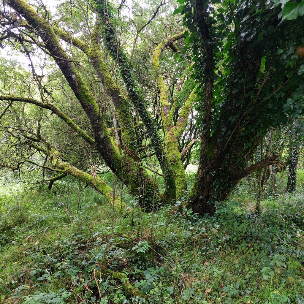 Wir folgen dem trail noch ein Stück weiter. Der Boden ist feucht um den See, die Bäume stark bemoost. Die Brombeere hat auch hier das Unterholz flächenmäßig voll im Griff. Die Kinder quasseln über gemeinsame Schulerlebnisse von kurz vor den Ferien, wir Erwachsenen erinnern uns an Erlebnisse von der Arbeit. Nur langsam lassen wir den Alltag los. Wir sind nun eine Runde gelaufen und kommen wieder am Auto an.