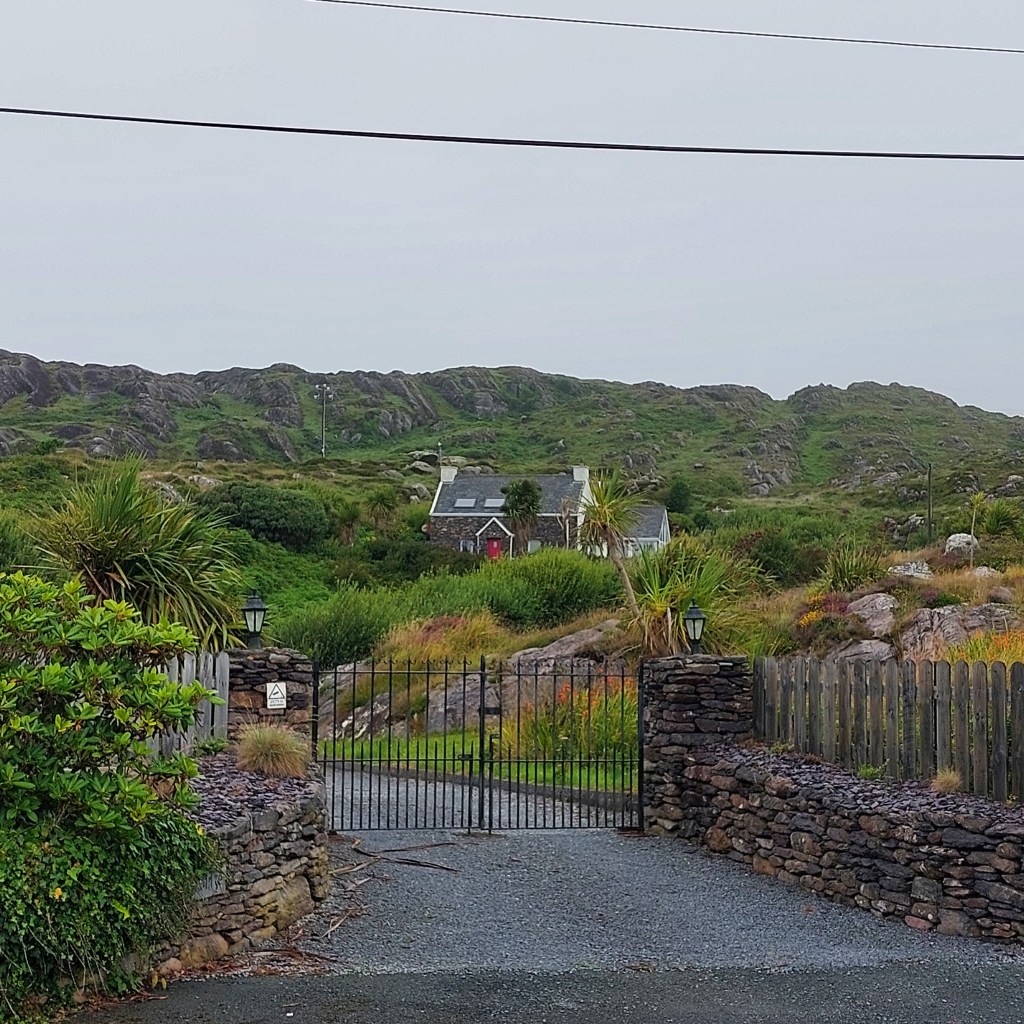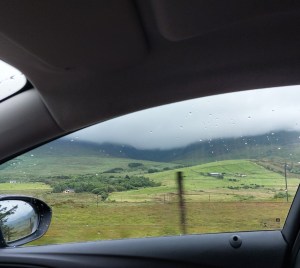 Wir fahren weiter in südwestlicher Richtung. Die Landschaft ändert sich. Aus den sanften Hügeln sind Berge geworden, deren Kuppen heute in den tiefhängenden Wolken verschwinden. Ich fange an den Grüntönen Namen zu geben: blasses Dunkelgrün bei Bewölkung. Helles Hecken-gelbgrün. Auf der Stadt- Autobahn von Cork kann man durchaus mal von dichtem Verkehr sprechen. An der Autobahnabfahrt bezahlen wir brav unsere Maut (geht per Kartenzahlung). Die Landstraße sieht aus wie frisch in den Felsen gehauen. Wir werden an unseren Urlaub auf Teneriffa erinnert. An den Hängen erstreckt sich eine Wiesenlandschaft, die zunehmend felsig durchsetzt ist. Gelber Ginster und purpurnes Heidekraut blühen in der nun schrofferen Landschaft. Die Kinder quasseln auf der Rückbank, machen Pläne für den Zoo, den sie später mal zusammen betreiben möchten. Sie streiten sich ein bißchen, welches Tier in welches Gehege kommen soll. Die leichte Übelkeit vom Morgen ist vergessen (Schoko- Muffins mit extra Nutella bestrichen und Kakao…!)