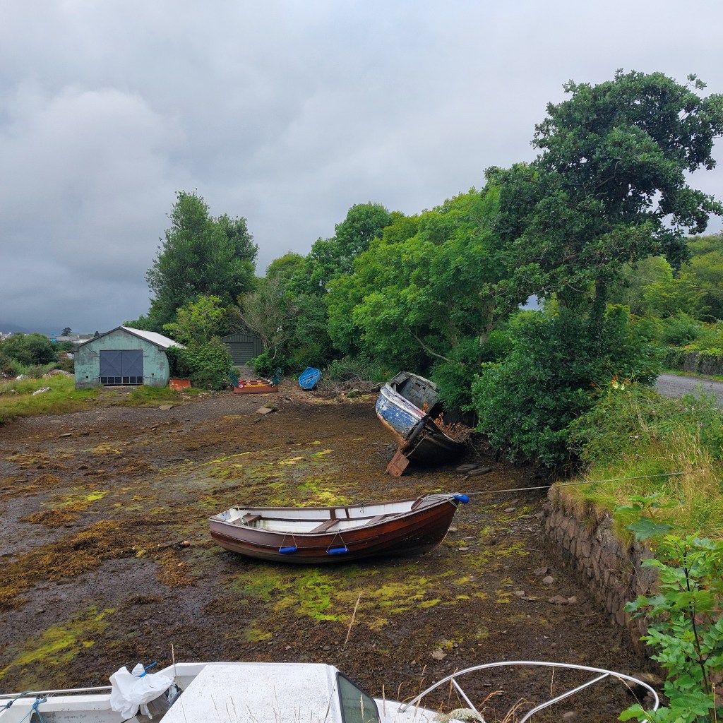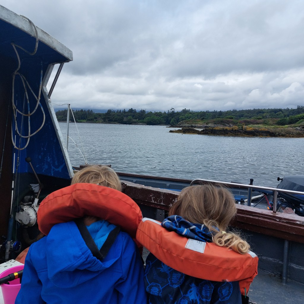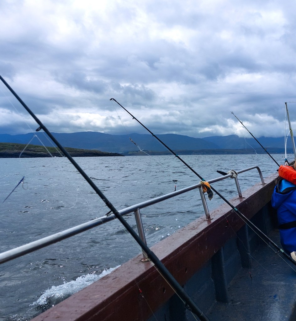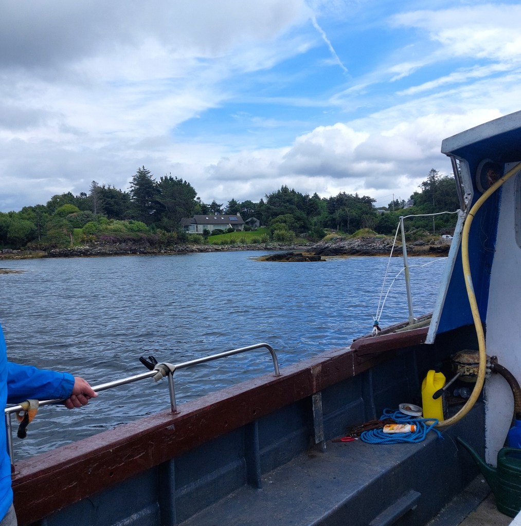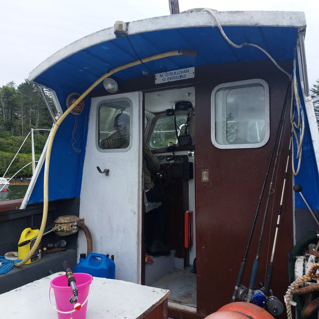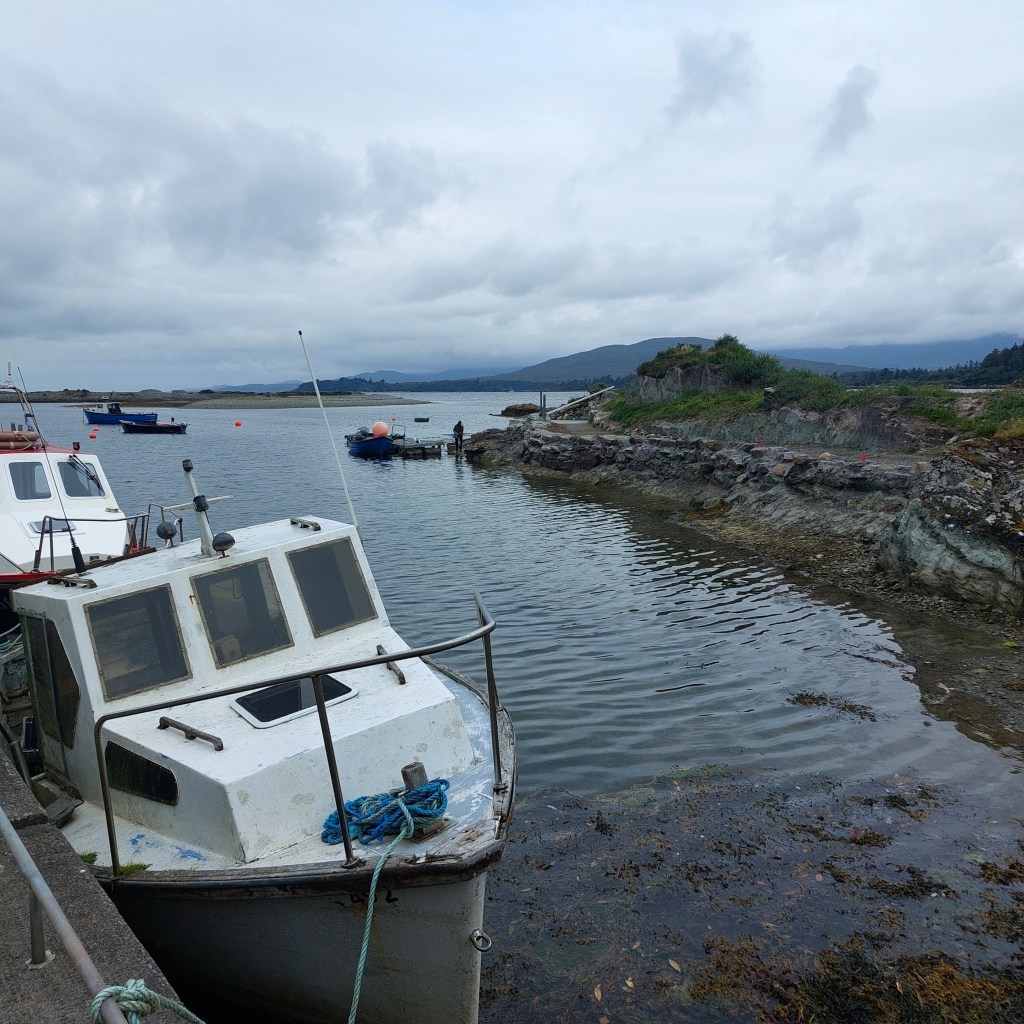 Today is the day: wir gehen Fischen! Mit einem echten fisherman! Jackie hat unsere Verabredung auf eine Touristen-verträgliche Zeit gelegt: um 10Uhr treffen wir uns am Souvenirladen im Ort. Pünktlich halten wir mit dem Auto davor. Bald kommt ein Mann in einem Pick-up aus der entgegengesetzten Richtung angefahren und hält gegenüber des Ladens. Wir schauen uns aus den Autofenstern heraus an und ein gegenseitiges Erkennen blitzt in unseren Augen auf. Er lächelt und winkt in seine Fahrtrichtung, dass wir ihm folgen sollen. Robert dreht das Auto und los geht’s. „Fischer reden nicht viel“, weiß Abenteurer Frodo. Bald biegen wir vom Ring of Kerry ab auf eine schmale Straße Richtung Kenmare Bay und halten schließlich direkt an einem Kai am Wasser. Als wir ausgestiegen sind, begrüßen wir uns mit Handschlag. Ein rundum sonnengebräuntes, wettergegerbtes Gesicht schaut mich an. Seine blauen Augen funkeln frech unter der Sonnenkappe hervor. Jackies Alter ist schwer zu schätzen: vielleicht 70 Jahre? Oder sogar älter?