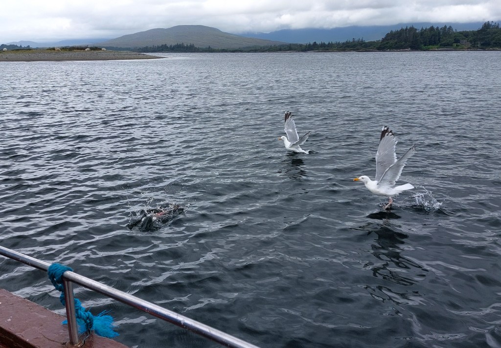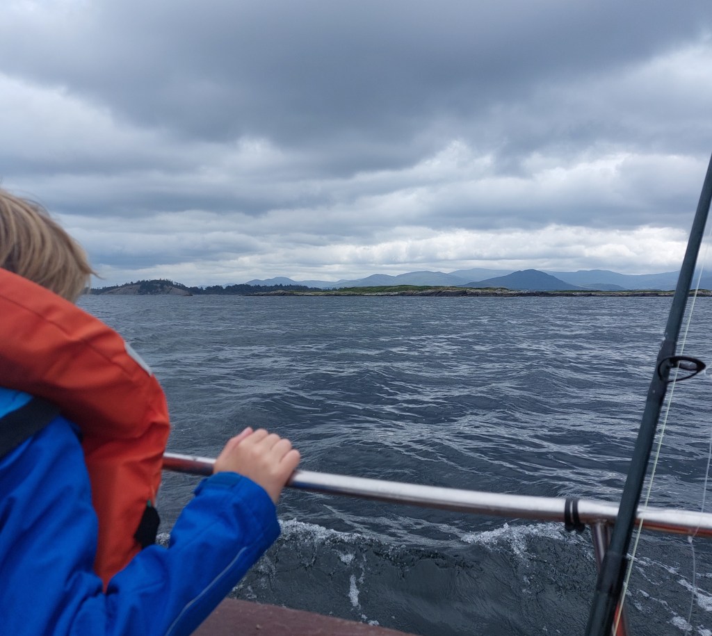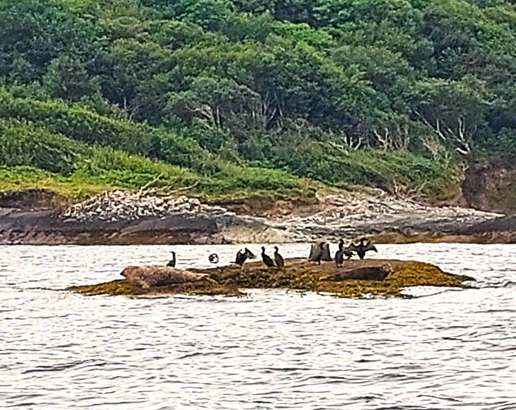 Wir sind noch keine 5min motort, da frage ich die Kinder: „Wer kann mir ein großes Säugetier zeigen?“ „Schaaafffeeee“, antwortet Frodo, der Naturkenner, gelangweilt. „Ja, aber eines, was auch im Meer lebt?“ Da schauen sie genauer hin: da vorne auf einem kleinen runden Eiland teilen sich zwei Robben ihren Ruheplatz mit Möwen und Kormoranen. Ihre fleckige Fellfarbe tarnt sie wirklich gut auf Felsen, die ebenso fleckig sind von Algen- und Flechtenbewuchs. Aber mit etwas Übung entdeckt man in der Bucht immer wieder an der Uferlinie diese dicken Würste, die hinten spitz zulaufen. Wir fahren lange in die Bucht raus. Oder fahren wir weiter hinein, weg vom offenen Meer? Wir sehen Felsen und Uferlinien in verschiedene Richtungen, ich habe keine echte Orientierung mehr. Frodo schaut aufs Wasser uns gibt sich der Wellenbewegung hin. Die kleine Elfe wird nach einer Weile quengelig. Hunger? Pipi? Kalt? gehe ich die Möglichkeiten durch. Die Elfe ist bis jetzt noch in allem, was gleichmäßig schaukelt, eingeschlafen. Ich denke, sie ist müde. Sie nestelt sich auf meinem Schoß ein und die Äuglein werden schmal. Vor einer Felsendurchfahrt steuert Jackie das Boot längs zu den Wellen und das Boot beginnt ordentlich zu schaukeln. Er lässt den Motor laufen und verlässt das Steuerrad. Wir Landratten sehen uns etwas verängstigt an. Jackie merkt davon nichts, er bewegt sich sicher an Bord und beginnt die Angeln vorzubereiten. Eine Angel nach der anderen wirft er aus und lehnt die Ruten gegen die Bootswand. Abwechselnd nimmt er sie zur Hand, macht nur einige sanfte, federnde Bewegungen nach oben und unten. Die Schnur ist auf vielleicht 5m Schnurlänge abgespult, schätze ich. Schon nach kurzer Zeit entscheidet er, dass es an dieser Stelle nichts wird und holt die Angeln wieder ein. Wir fahren zu einer anderen Stelle. Dieses Spiel wiederholen wir noch mehrmals. Bald werfen wir selbst die Angeln aus und machen alles genau so nach wie Jackie es uns zeigt. Aber wieder holt Jackie nach kurzer Zeit die Angeln ein. Robert und ich sehen uns fragend an, Frodo wird langsam ungeduldig.