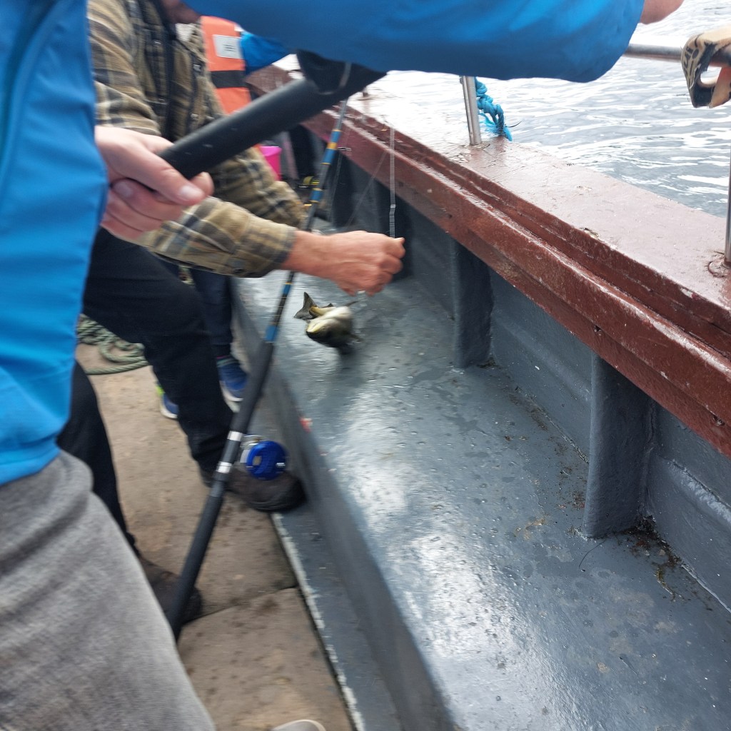An der vierten Angelstelle ruft Frodo plötzlich „Da ist was!“ Dann geht auf einmal alles ganz schnell. Jackie hilft die Angel einzuholen und tatsächlich: Frodo hat einen dicken Fisch an der Angel! Mit einem Mal sind alle wieder wach an Bord. Ich möchte coole Fotos von jedem einzelnen Schritt machen, doch das Boot schaukelt ordentlich, ich habe zur Sicherheit eine Hand an der Elfe und selbst noch eine Angel im Wasser und traue mich keine Hand loszulassen. Zung! Schon spannt sich Roberts Angelschnur! Auch Robert soll die Angel einholen und wieder ist ein ordentlicher Fisch dran, Jackie hilft beim Einholen und beim Abheben des Fisches vom Haken. Noch währenddessen merke ich wie mir die Angel fast ins Wasser gezogen wird, ich muss nun mit beiden Händen gut gegenhalten. Ich schaue fragend zu Jackie. Er nickt nur, das Zeichen, dass ich die Schnur einholen soll. Jippiiieh! Auch ich habe einen Fisch gefangen. Ich hole die Schnur fast ganz ein und probiere den zappelnden Kerl ans Bootsdeck zu schleudern. Die Stimmung ist jetzt ausgelassen und euphorisch an Bord. Jackie fährt uns noch an eine andere Stelle, etwas geschützt vor einem Felsen. Auch an dieser Stelle holen wir noch zwei Fische aus dem Wasser. „How did you know…?“ beginne ich die Frage. Er lächelt nur, macht eine vage Handbewegung über die Gegend. „Been fishing here for years.“ Nachdem der Fang gesichert ist, beginnt Jackie die Navigation Richtung Heimathafen. Jetzt ist Zeit für small talk. Auch unser fisherman wirkt sichtlich zufrieden, freut sich für uns, dass wir mit einem guten Fang nach Hause kehren.