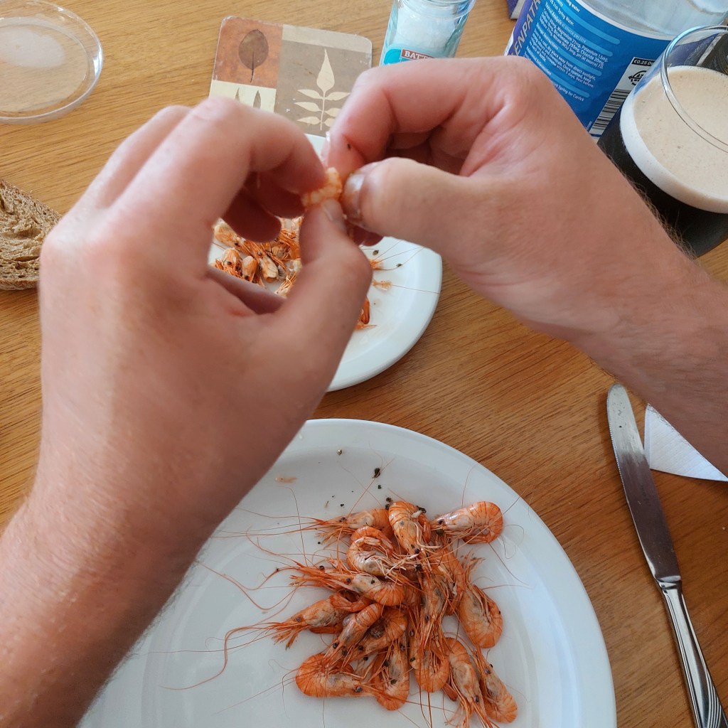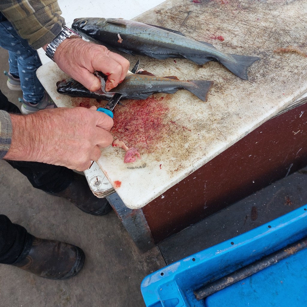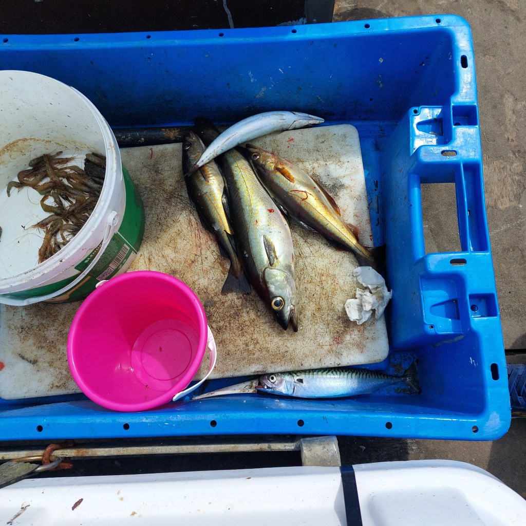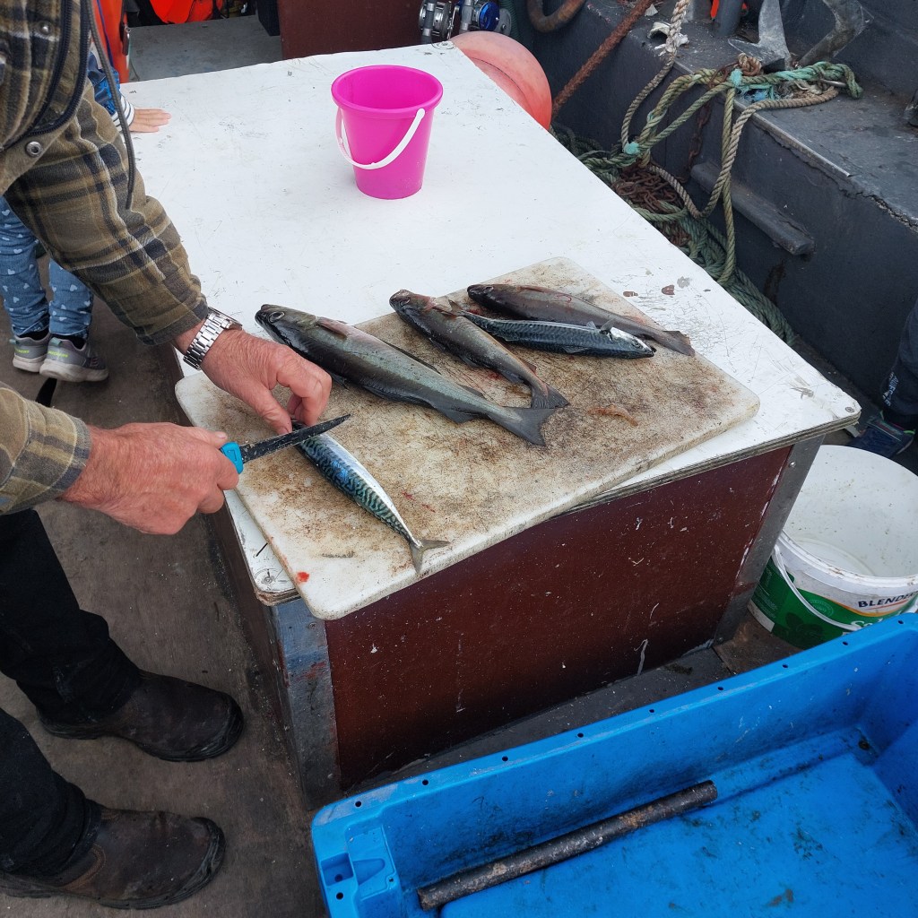Als der Kutter wieder an der Boje neben der Schaluppe festgemacht ist, betrachten wir gemeinsam unseren heutigen Fang. Die großen Fische heißen irgendwas mit „white…“ wir verstehen es leider nicht richtig. Die buntschillernden, etwas kleineren Fische sind Makrelen. Wir fragen nach Tips für die Zubereitung. Jackie erklärt wie man die Fische einfach mit etwas Butter in der Pfanne anbrät. Als ich noch mit den Händen andeutend frage, wo die Schnitte zumachen seien, holt er kurzerhand sein Fischermesser und ein Brett heraus, trennt die Köpfe der Fische ab, gefolgt von einem Bauchschnitt und er entnimmt die Innereien. „Give it to the birds“, sagt er zu Frodo und deutet auf die Reste, die wir Menschen nicht verwerten werden. Die Geduld der Möwe, die uns bis hierher zurück gefolgt ist, hat sich gelohnt. Er schüttet uns außerdem noch die Garnelen in unser rosa Sandeimerchen. Unsere Angel- Lektion für heute: Wenn man Angeln geht, am besten einen Eimer oder einen Beutel für den Fang mitnehmen, falls man tatsächlich etwas fängt!